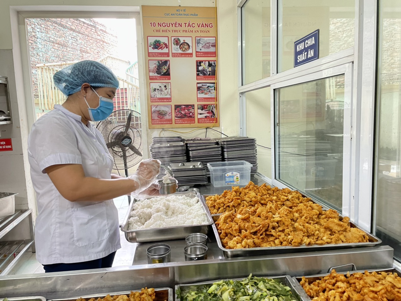 Các nhân viên tham gia công tác bán trú có đủ trang phục như: Quần áo đồng phục, găng tay, khẩu trang, ... Nhân viên phục vụ mặc đồng phục thường xuyên trong quá trình làm việc. Trang phục sạch sẽ, gọn gàng, thuận tiện cho làm việc. Phòng bếp thường xuyên được tổng vệ sinh, lau sàn nhà, bếp nấu, ... sau mỗi bữa ăn. Trên các lớp có đủ ánh sáng, có điều hòa, quạt trần để học sinh đủ mát khi ăn cơm vào mùa hè và đủ ấm vào mùa đông.
