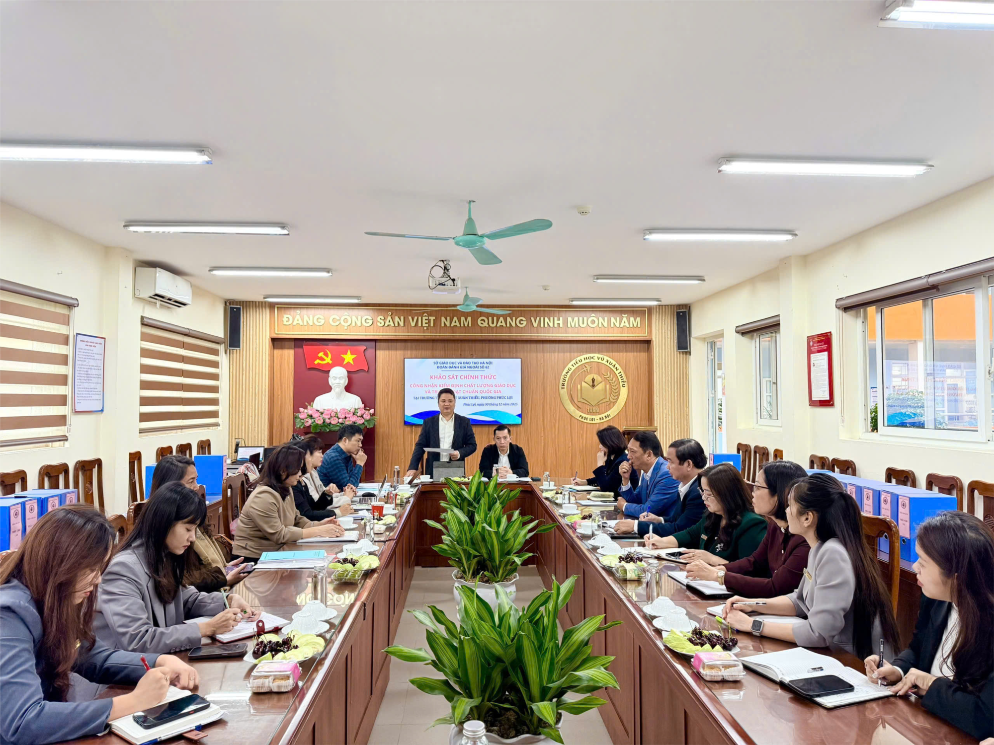 Tại buổi làm việc, Đoàn khảo sát đã tiến hành khảo sát thực tế cơ sở vật chất, trang thiết bị dạy học; nghiên cứu hồ sơ minh chứng; đồng thời làm việc trực tiếp với Ban giám hiệu, các đồng chí tổ trưởng chuyên môn, giáo viên, nhân viên và đại diện cha mẹ học sinh của nhà trường.