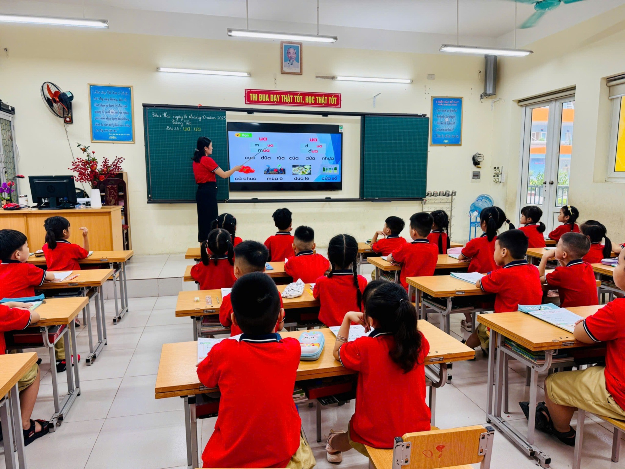 Trong tiết học, cô Hoàng Hải Yến đã linh hoạt kết hợp các phương pháp dạy học tích cực và ứng dụng công nghệ thông tin. Các em được quan sát hình ảnh sinh động, đọc, viết, và luyện phát âm đúng các vần “ua - ưa”. Cô hướng dẫn học sinh viết chữ đều, đẹp, đúng quy trình, đồng thời động viên, kèm cặp từng em trong quá trình luyện viết.
