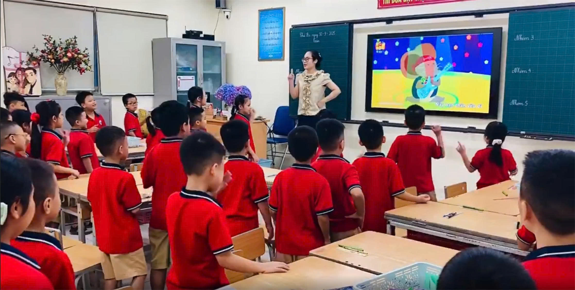 Để khởi động tiết dạy các em học sinh đã cùng hát và vận động theo nhạc qua đó các em có thêm hứng khởi bước vào tiết học.