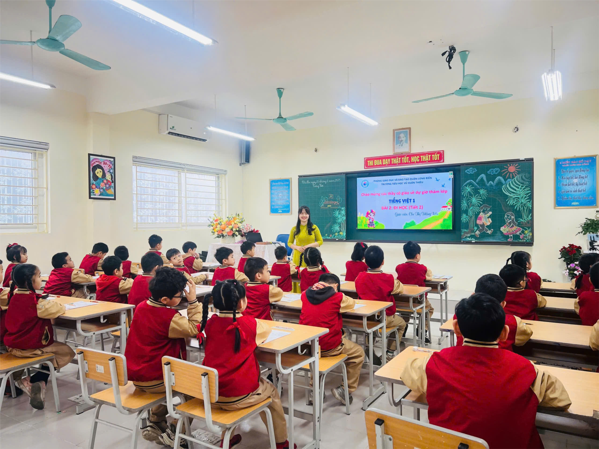Cô giáo Chu Thị Hồng Vân và các con học sinh lớp 1A5 đã thực hiện tiết dạy bài “Đi học” của môn Tiếng Việt lớp 1 đầy bổ ích và lí thú. Trong tiết học, cô giáo Hồng Vân đã thể hiện khả năng sư phạm của mình, đồng thời chia sẻ những phương pháp giảng dạy mới mẻ và sáng tạo.