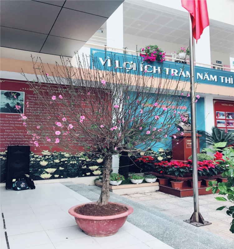 động đón xuân, trang trí cảnh vật xung quanh trường nhằm tạo bầu không khí xuân